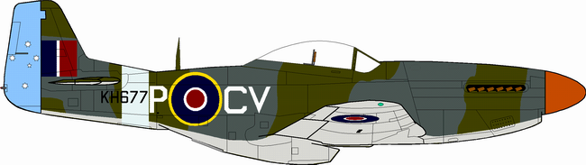 I have only located photos of 3 airframes which appear to have been painted in this scheme in 3 Sqn RAAF service. They are CV*G KH679, CV*P KH677 (later CV*◊) and CV*E KH710. These three aircraft along with CV*P KH716 (in NMF) were all delivered in 1944. Later deliveries of camouflaged P-51Ks to 3 Sqn all appear to have consisted of the 'firewall' scheme which uses a different pattern (but still in the ANA colours).