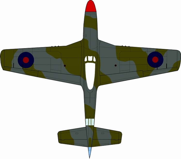 Photo via D. HouriganThis is the only known photo of S/Ldr Murray Nash's first P-51K, coded CV*P serial KH677. There has been some conjecture as to exactly which scheme this airframe is actually in due to the photo showing so little to go by. The fact that it has the ANA 610 Sky Blue fuselage band, and that the serial is presented in the same style as CV*E KH710 above, leads one to conclude that it is really in this T.O. scheme as Dick Hourigan concluded in his APMA article. I have drawn the starboard side of the airframe to show how the pattern is arranged on that side for those wishing to model one of these two machines.