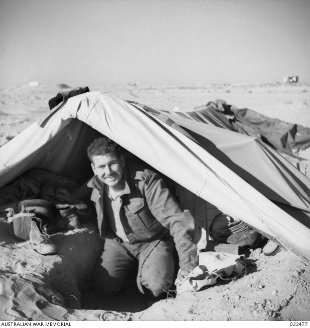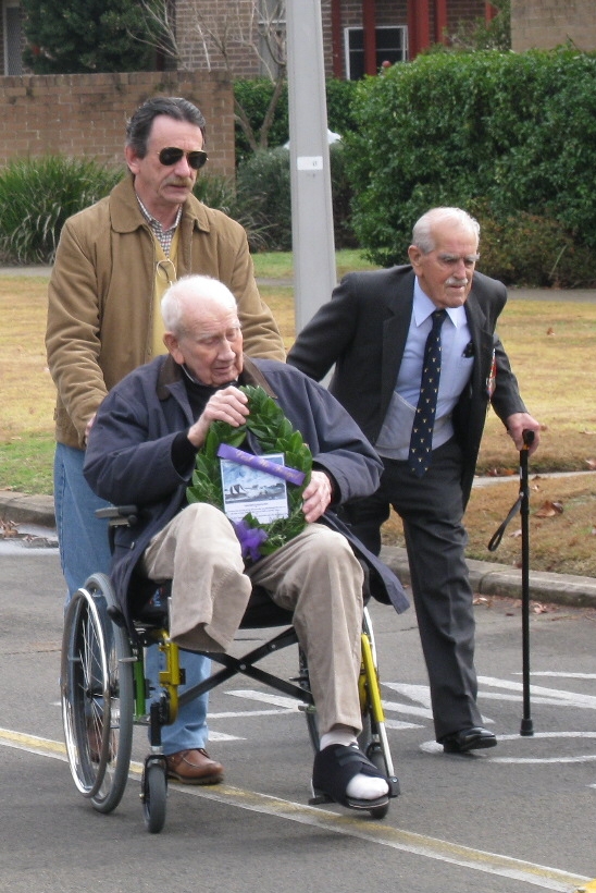 Les Fitzpatrick. Centre (in wheelchair): Les was a highly skilled Engine Fitter during his time in 3 Squadron. These men worked outdoors in atrocious desert conditions of dust and blowing sand (and then mud whenever it rained), maintaining their delicate and tempremental aero-engines. Les marched out of Richmond as a Leading Aircraftman and finished the war as a Technical Flight Sergeant.