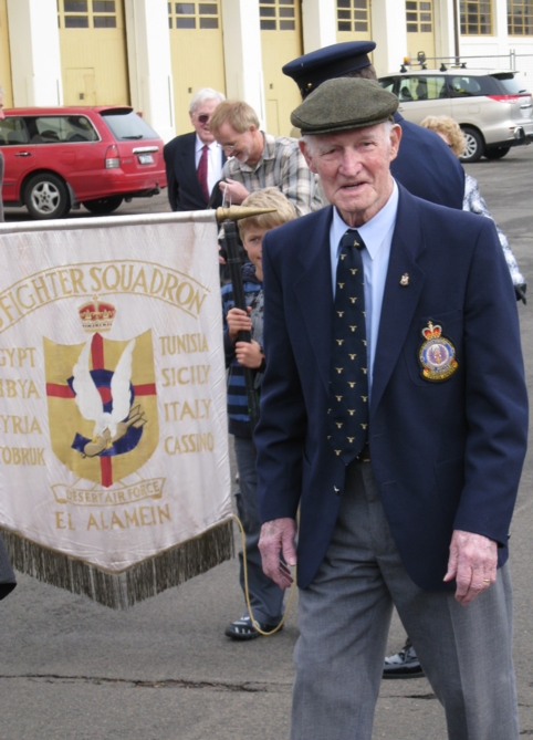 Other notable figures from 3 Squadron Association (to the right of Eric Baker): Slim Moore (sunglasses; former Engine Fitter), Tom Russell (cap; former Kittyhawk pilot), Arthur Pardey (former Mustang pilot), Vicki Crighton (3SQN Association Secretary) and Wing Commander Terry van Haren, current Commanding Officer of 3SQN, flying FA/18s at Williamtown.