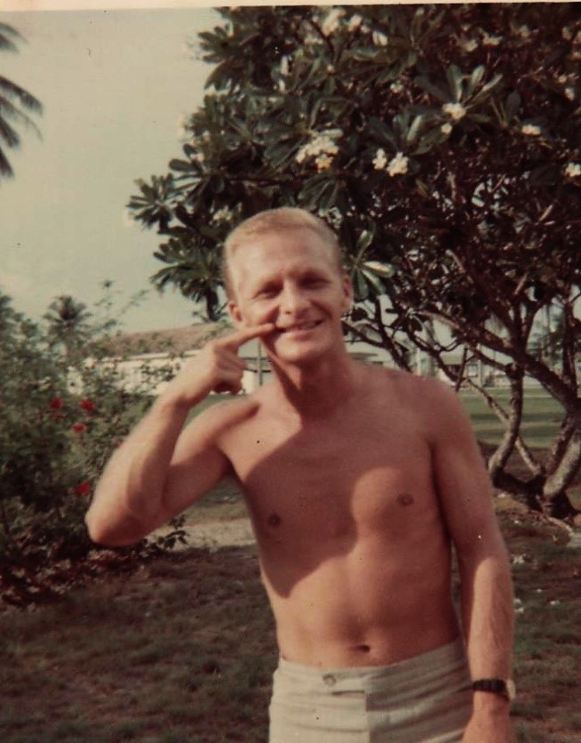 When Jim got back from Singapore he walked inside the house and I said something is different with you, but I could not put a finger on what was different, as it was so long since I had seen him. Finally, when I kissed him, I noticed his hairy lip. Apparently they had a bet - who could grow the longest and best moustache. Jim did not win! Jim's was thick, but you could not see it, as it was white because he had very blonde hair. So I had to take a photo of him pointing to his top lip to prove he had a moustache.