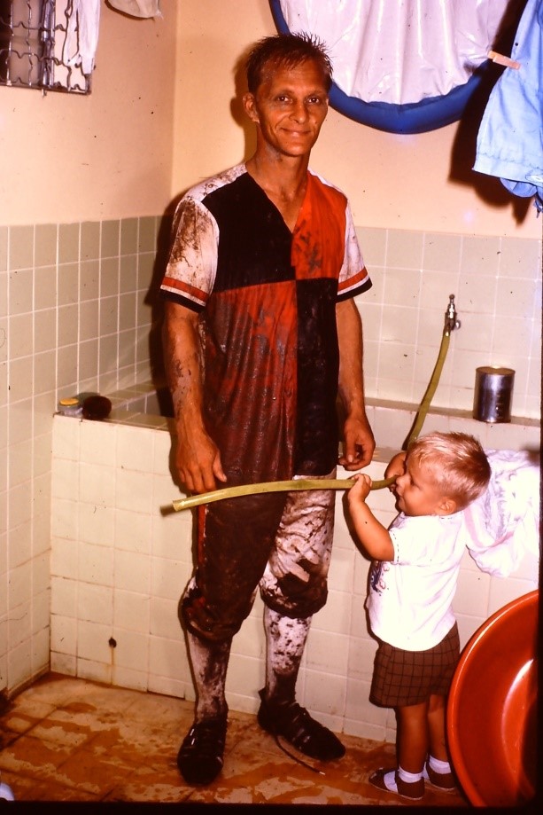 Michael loved watching his Dad play Softball, my friends couldn't believe how Michael used to just sit quietly on the rug and not run around, I trained him well. Some days the field would be all mud for them to play in and when Jim got home we had to take him into the laundry to hose him down, before he could go upstairs for a shower. This is a picture of Michael hosing his Dad off after a game.