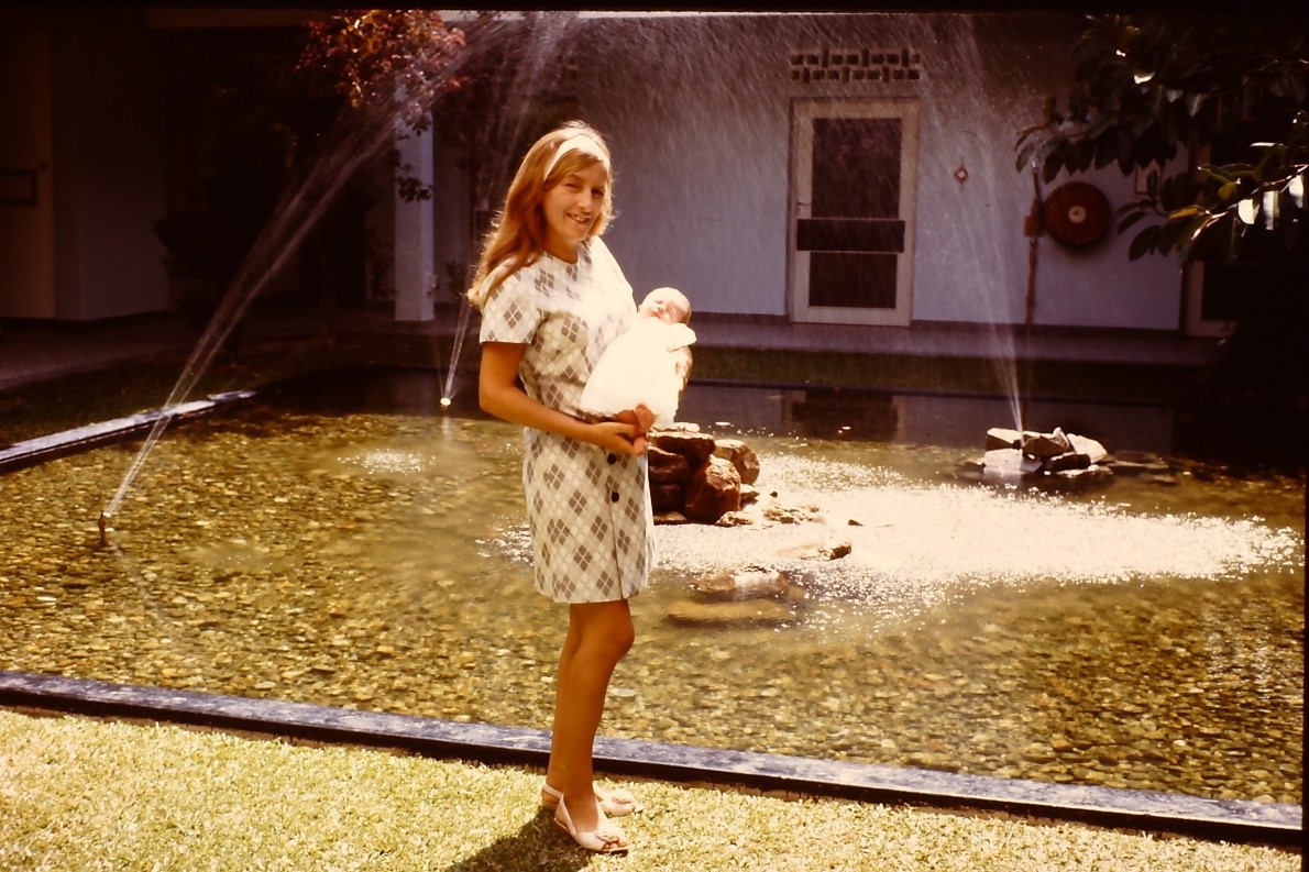 Teresa was born in March 1970 at the British Far East Hospital at Minden Barracks on Penang Island (now a university). This photo is of me holding my new daughter in the centre courtyard of the hospital before going home.