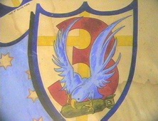 Temperate Dark Green / Dark Earth upper surface scheme. The undersurfaces were painted in a colour called 'Sky Grey' (roughly #FS36595). Codes in White and serials Black with Red Spinner. Below is a reproduction of the actual 3 Sqn insignia that was painted on a flag which hung in the Pilot's Mess (the original was held by the Secretary of the S.A Branch of the Association last thing I know). Next to it is the reproduction that is given on the AMTech decal sheet. The decals are more accurate than they look as the badge on the actual aircraft was a bit different (see the photos below).