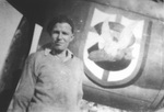 Photos show L-R: An overall shot of CV-V with the artwork applied. At this stage it also has the replacement wingtip (Neutral Gray below & probably Olive Drab above). The next two are close-ups of the artwork applied to the nose. Notice there are differences to the version on the flag shown above. The crest is basically a bird with bomb (a Kittyhawk maybe) and the number '3' superimposed on the standard Desert Air Force badge. Finally a photo of Brian Eaton himself. Photos - Arthur Dawkins & Ken Richards