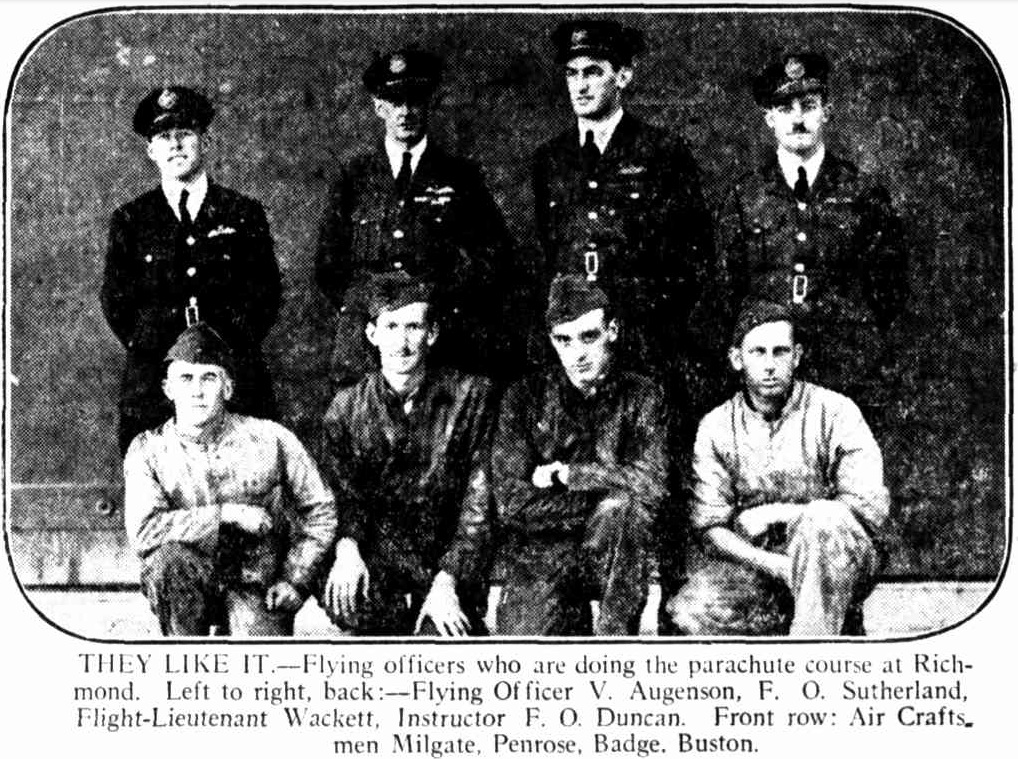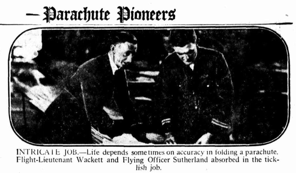 Flying-Lieut. Wackett [who became a leading figure in RAAF Engineering over the next three decades] took the precaution of first having dropped from the 'plane a dummy approximating the weight of a man. Six more airmen have yet to win their spurs in parachute descents before the end of next week. - It will be Flying-Officer Ducan's turn today for the first descent and Flying-Officer Sutherland will follow.