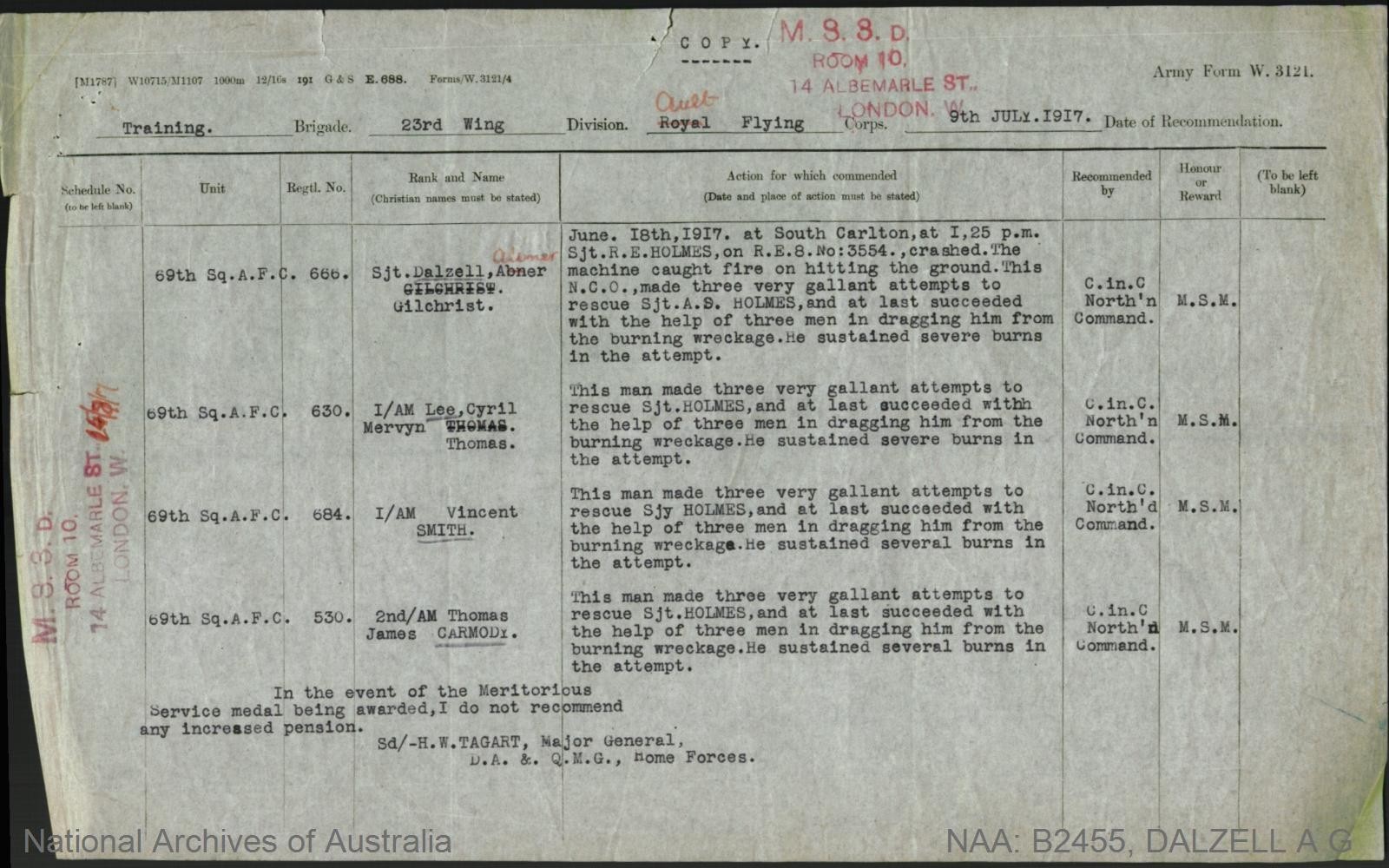 Vincent ("Vin") Smith was born in the Melbourne suburb of Middle Park in 1890. He joined the Australian Flying Corps in March 1916 and was a 3AFC “original”, joining ‘B Flight’ as a mechanic on 26 August 1916 (well before 3AFCs official “birthday”). Vincent was promoted to Corporal before 3AFC’s departure to Europe in October 1916. After several training courses in England he was then promoted to Sergeant, in preparation for their move to the Western Front in August 1917. Before leaving England, Vin had been awarded the Meritorious Service Medal for bravely rescuing a pilot from a blazing crash (after three attempts, in which he himself was burned).