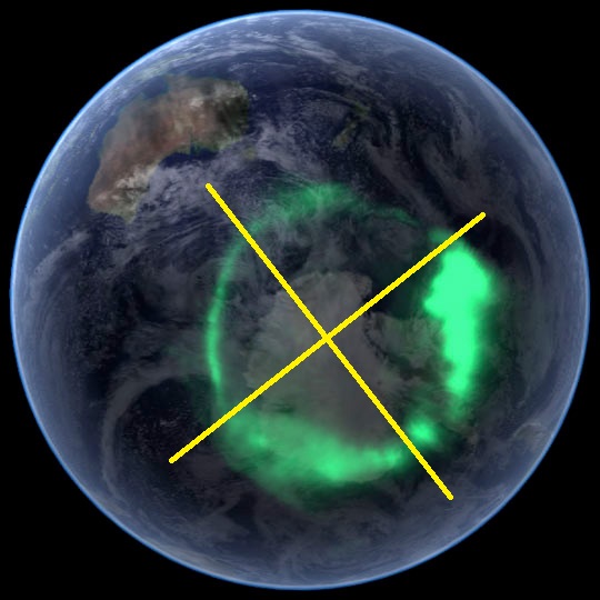 - Why the core of the Earth stays hot (it’s made of iron-nickel alloy similar to a toaster element, and it has a strong electrical current flowing through it!).Also I tried to make an observational prediction, to convince myself that this model had legs. If there are really four magnetic segments to the Core, then this should show up as a “square” symmetry within the Aurora. Amazingly, the very first picture that I found of the Aurora Australis shows exactly that: