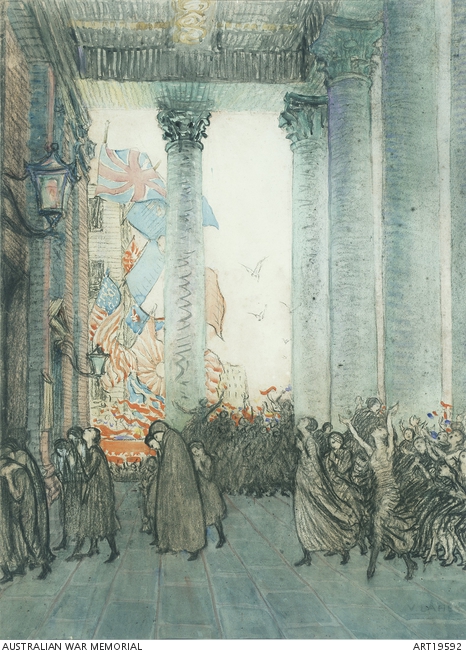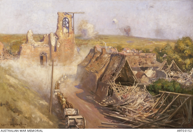 Going in through Sailly-le-Sec, 1918. [AWM Copyright ART03152, by Louis McCubbin.]