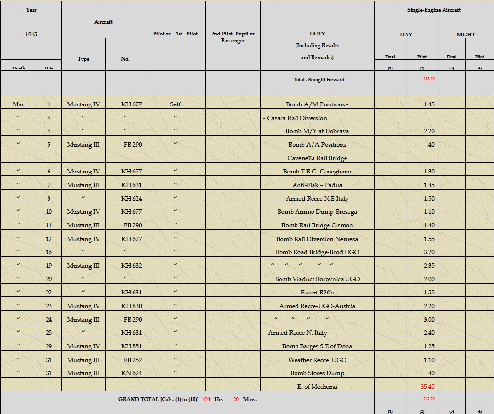 Leonard William "Bluey" Beales (RAAF Service No. 434137) was one of 3 Squadron's Mustang pilots at the end of World War II. This extract from his logbook, covering his tour of operations up until the German surrender in Italy (a few days before "VE" Day was celebrated elsewhere) shows the unrelenting nature of the Squadron's dangerous work, and the typical load on one individual pilot.