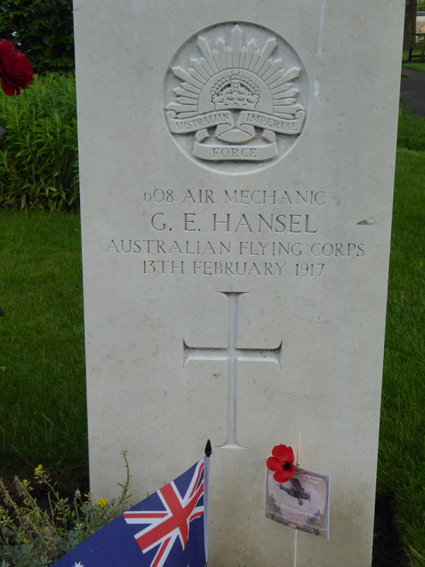 George Hansel came from Woollahra, NSW. He was a Mechanical Draftsman, declaring his age as "21", when he joined the AFC in Sydney on 4 September 1916. On 25 October he embarked on HMAT A38 Ulysses at Melbourne for travel to the UK. After arrival in Britain he attended an RFC trade school for Fitters in Edinburgh, before returning to No.69 (Australian) Sqn on 7 February, where he was made an Acting Sergeant. Two days later he was admitted to hospital with cerebro-spinal fever, for which there was limited treatment available in those days. He died from meningitis in Lincoln Hospital on 13 February 1917.This was tragic, but it becomes even more so when we read George's extensive obituaries in the Sydney newspapers. - He had been a brilliant student and a very talented Engineer. He was admired by many friends. Additionally, George was one of the top athletes in NSW, having won sprinting competitions over several years. If an Olympic Games had been held in 1916, George would probably have gone. (Ironically, the 1916 Games had been planned for Berlin!)