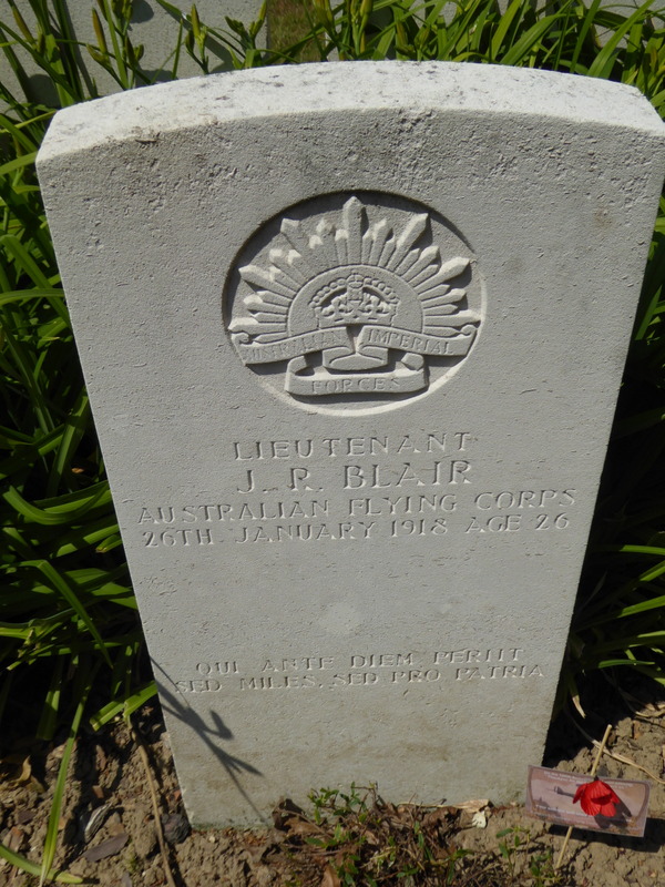 John Blair came from Rockhampton, Queensland. He was born on 21 January 1894 and was a Pastoralist when he enlisted in the 25th Infantry Battalion at Brisbane on 23 July 1915. He left from Brisbane on HMAT A48 Seang Bee on 21 October. After service at Gallipoli he transferred to the 9th Battalion in March 1916. He received a bayonet wound in his right knee during the Battle of the Somme in July and was sent to Newcastle in England for hospital treatment. After recovery, he transferred to the AFC in April, and trained as an observer before being commissioned in June. He joined No.69 (Australian) Sqn on the Western Front in September and was injured in an accident in RE8 A3756 in October. He had a short spell of leave in the UK before rejoining the squadron on 13 January.Lt J. R. Blair is buried in Grave III F 50 at Bailleul (Extension) Cemetery, France.