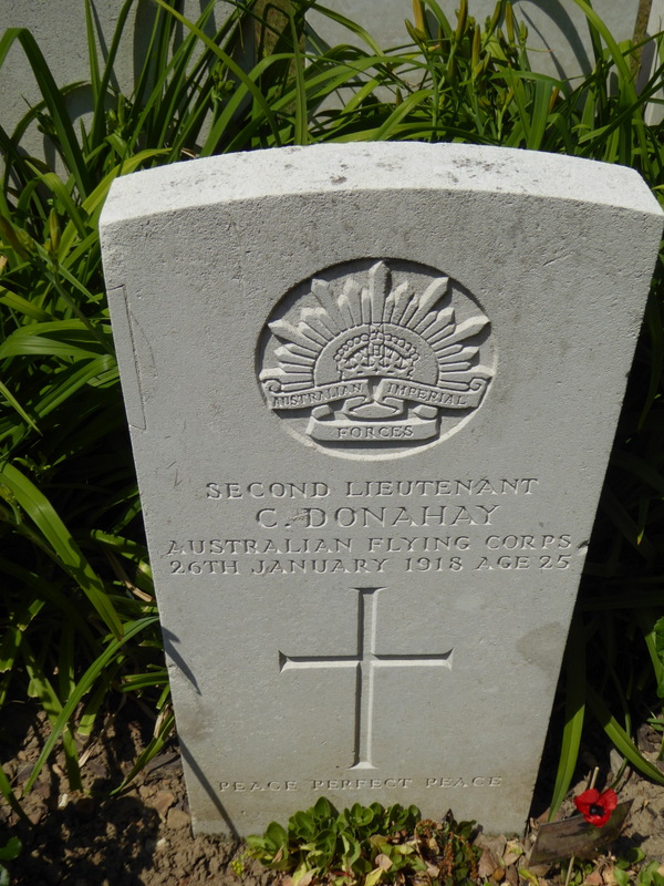 Clarence Donahay came from Melbourne. He was born on 14 February 1892 and working as an Optician when he joined the Australian Army Medical Corps in Melbourne on 15 March 1915. He departed from Sydney with the 1st Australian General Hospital on HMAT A55 Kyarra on 13 April and, having been detailed to look after repatriated casualties, he returned in September on HMAT A17 Port Lincoln. He transferred to No.2 Sqn AFC at Laverton on 24 October 1916 and left Melbourne on HMAT A38 Ulysses the next day. He served in the AFC in England until he was commissioned in October 1917 after completing flying training. He was then posted to 3rd Sqn on the Western Front.He was killed in action on 26 January 1918 when flying RE8 B2259, with Lt J. R. Blair as Observer, who was also killed. The aircraft was hit by anti-aircraft fire and crashed at Dranoutre when returning after checking visibility for artillery observation.