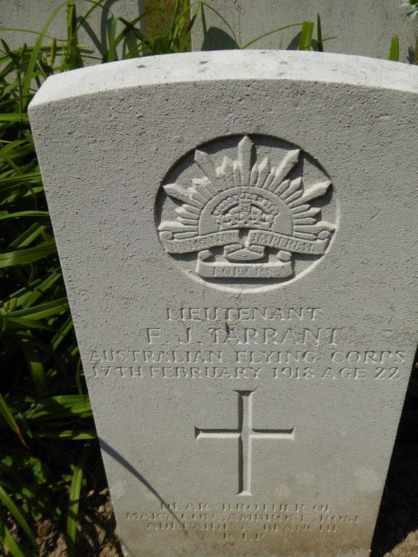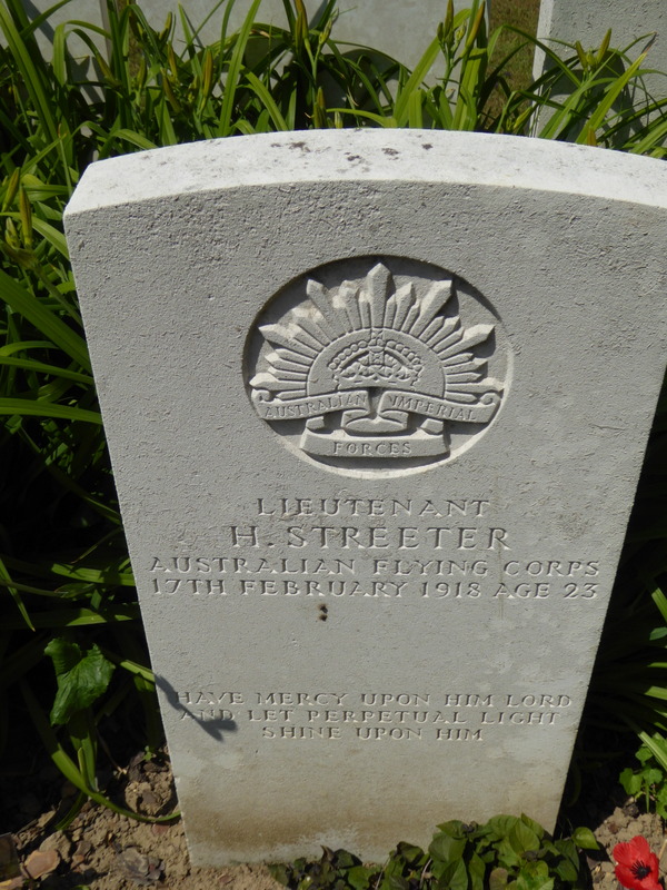Henry Storrer was born in Geelong, Victoria, on 3 September 1888. He was an Accountant, or a Motor Garage Manager, or a Shipping Clerk. (According to different copies of his enlistment papers!) He was serving as a Captain in the AMF's 8th Garrison Artillery, when he joined the AFC at Laverton as a Lieutenant on 24 October 1915. He spent three months with the Aviation Instruction Staff, learning to fly at Point Cook. On 25 October 1916 he embarked on HMAT A68 Ulysses at Melbourne as the acting Commanding Officer of 3AFC/No.69 (Australian) Sqn, RFC. On arrival in the UK he was posted to various RFC Units for higher instruction in military aviation. He was promoted to Captain, and appointed as a flight commander, in August 1917, when the squadron left the UK for the Western Front.He was killed in an aircraft accident at Bailleul on 2 December 1917, while piloting RE8 A3755. Lt W. N. E. Scott, Observer, was also killed. A strong wind was blowing and flying had been cancelled, but Storrer and Scott volunteered to try and find a German high-velocity gun that was causing particular problems for the Australian front line. They took off from Bailleul (Town Ground) Aerodrome. As Capt Storrer turned to avoid a line of trees, a sudden squall turned the RE8 upside down so that it crashed onto the stone wall of Bailleul Cemetery.
