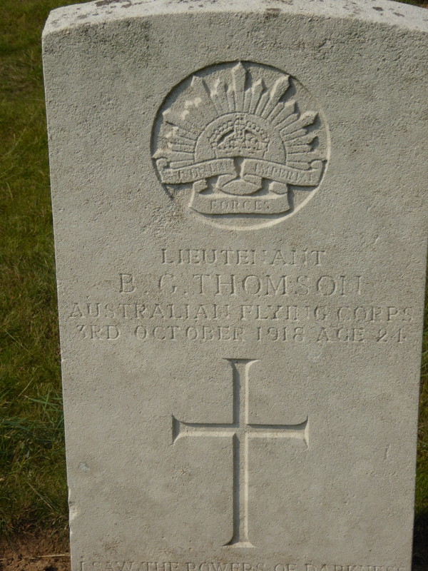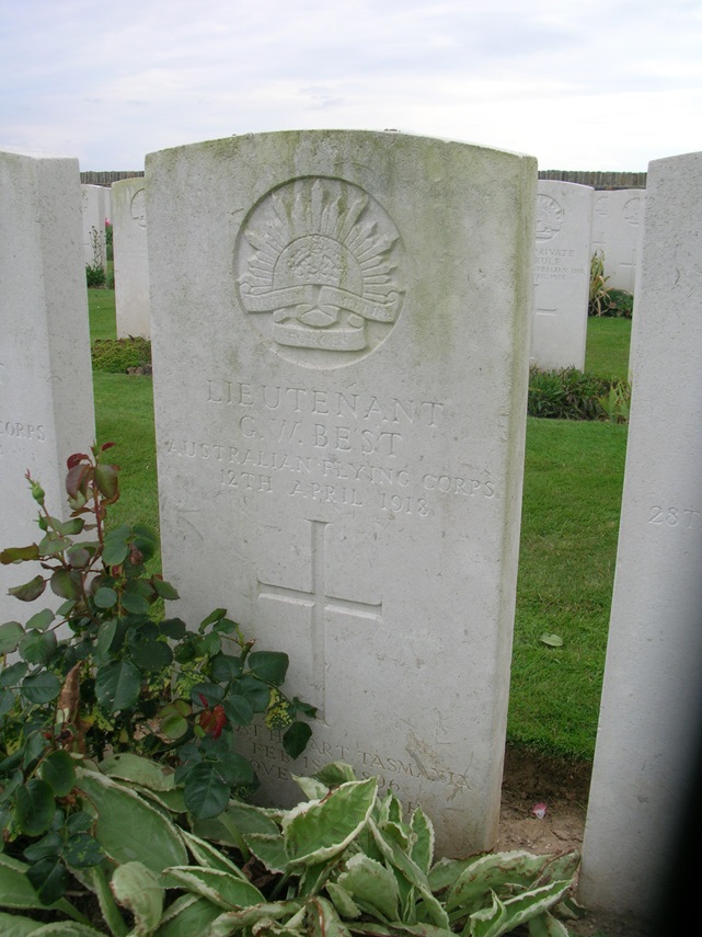 George Best came from Hobart, Tasmania, and was a Draper aged 20 when he enlisted in the AIF at Claremont, Tasmania, on 12 October 1916, before being assigned to 4th Sqn AFC at Laverton in January 1917. He departed from Melbourne as an Acting Corporal on HMAT A5 Omrah on 17 January. After flying training in England he was commissioned in November and promoted to Lieutenant in February 1918, before joining 3AFC on 4 April. He was killed only eight days later, in an aircraft accident at Poulainville aerodrome on 12 April 1918, flying RE8 B3435, with Lt O. G. Lewis as Observer, who was also killed. The aeroplane suffered an engine failure on take-off and crashed to the ground where it burst into flames.Lt G. W. Best is buried in Grave I A 20 at Vignacourt, France.