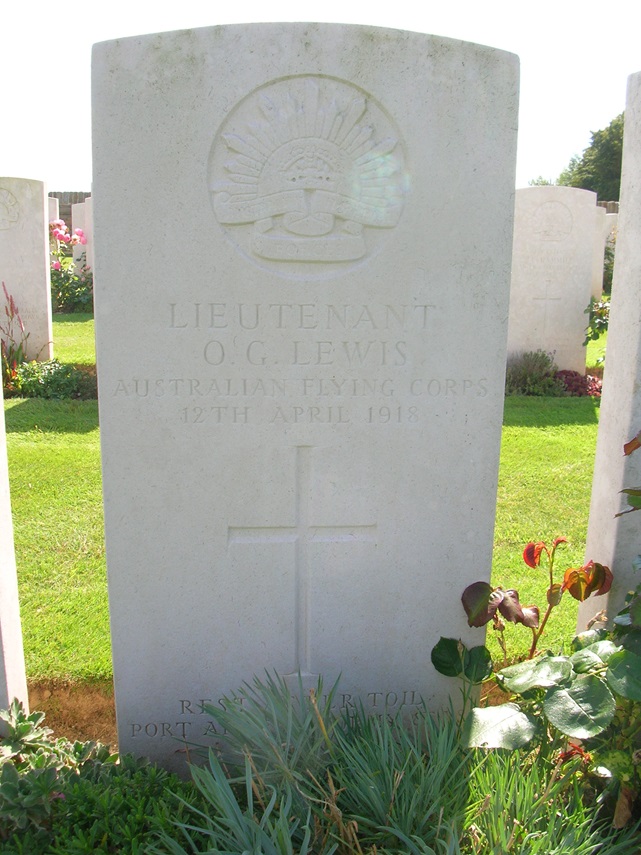 Owen Lewis was born in Armadale, Victoria, on 19 July 1896, and later moved to Elsternwick with his family. He was the older brother of Brian LEWIS, author of Our War, an account of the Great War as seen by a young boy growing up in Melbourne. On 3 January 1916, Owen, a former Engineering Student, enlisted in the 10th Engineer Field Company in Melbourne. He departed Melbourne on HMAT A54 Runic on 20 June. By February 1917, after service in France, he had been promoted to Corporal, and in April he applied for transfer to the AFC for Observer training. After graduation as an Observer, he was commissioned in July, with promotion to Lieutenant coming in October. By August he had been posted to No.7 Sqn RFC on the Western Front, flying the RE8 from Proven aerodrome. He was lightly wounded on 9 August while flying with 2Lt E. V. GIBSON (also wounded) and then again on 14 August while flying with Lt N. SHARPLES in A4734 on an artillery observation mission, when he was hit in the chest, arm and thigh. He was then sent to hospital in England. After recovery he was posted to No.69 (Australian) Sqn [soon to be renamed 3AFC] in January 1918.Lt O G Lewis is buried in Grave I A 21 at Vignacourt British Cemetery, France.