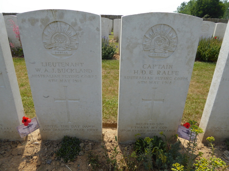 Henry Ralfe came from Sydney, NSW, where he was born on 29 May 1890. He was a Regular Army Officer in the Siege Artillery Brigade who had undergone flying training at Point Cook before he joined the AIF on 23 May 1915. He embarked on HMAT A67 Orsova in on 17 July. He served with the Headquarters of the 36th Artillery Brigade in France before transferring to the AFC in August 1916. After further training, he was engaged in training others in the UK before he was posted to No.69 (Australian) Sqn in France in September 1917. Unfortunately, after a month in France, he had to return to the UK for medical treatment, after which he commanded No.32 (Australian) Training Sqn at Yatesbury from October until 22 February 1918, and he did not rejoin 3SQN at the Front again until March 1918.He was killed in action over the Morlancourt Ridge on 6 May 1918, while flying RE8 A4404 with Lt W. A. J. BUCKLAND, who was also killed. The RE8 was attacked by several Fokker Dr.Is at 0715 and went down in flames. German Ltn Viktor von PRESSENTIN von RAUTTER of Jasta 4 claimed a victory; it was the 5th of his eventual 15 victories before his death in action in combat with French Bréguet bombers on 31 May.
