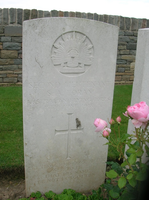 Stanley Loram came from Alphington, Devon, in England. He was 22, and a Farmer, when he joined the 11th Light Horse in Mildura, Victoria, on 23 December 1914. He left Melbourne on HMAT A34 Persic on 28 May 1915 and landed at Gallipoli in September. Within two weeks Corporal Loram was wounded in the arm and evacuated to Malta, and then on to Egypt. After discharge from hospital he trained as a machine gun instructor and was promoted to Sergeant. He moved to France to serve in the 4th Division Cavalry in March 1916. In December 1917 he transferred to the AFC and was trained as an Observer, after which he was commissioned in February 1918. In May he was posted to 3AFC on the Western Front.2Lt S. A. Loram is buried in Grave III E 7 at Vignacourt British Cemetery, France.