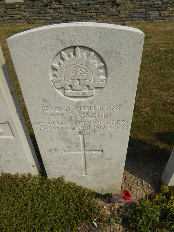 He was killed in action over the Hindenburg Line on 18 September 1918 (during an attack by the 4th and 1st Australian Divisions) while flying in RE8 C2490, piloted by Lt Dimsey, who was wounded. The RE8 was flying at about 300 feet while on a Contact Patrol, and had just located the attacking infantry at about 10.00 when the RE8 was hit by machine gun fire from the ground. Lt Dimsey returned to the squadron’s aerodrome, but 2Lt Machin died just after arrival.