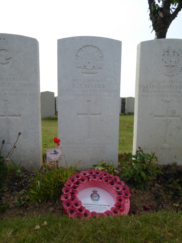 Edward Maher came from Melbourne, Victoria. He was an Engineer, aged 32, when he joined the 7th Pioneer Battalion on 14 July 1916; he transferred to the AFC in January 1917 and departed Melbourne on HMAT A9 Shropshire on 11 May. After specialist training in England, he joined No.69 (Australian) Sqn in France in August. He served with the squadron until he was infected with influenza and sent to hospital at the end of October 1918.He died from pneumonia at the 50th Casualty Clearing Station on 1 November 1918.