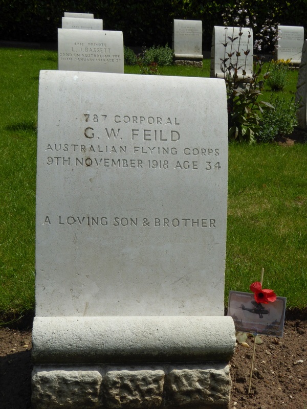 He died from pneumonia at Harefield Hospital on 9 November 1918. Cpl G. W. Feild is buried in Grave Aust 98 at Harefield (St Mary) Cemetery, Middlesex, England. This churchyard contains 120 First World War graves, mostly those of Australians who died in No.1 Australian Auxiliary Hospital at Harefield Park. Uniquely, their graves are marked by scroll shaped headstones, chosen by the staff and patients at the hospital.