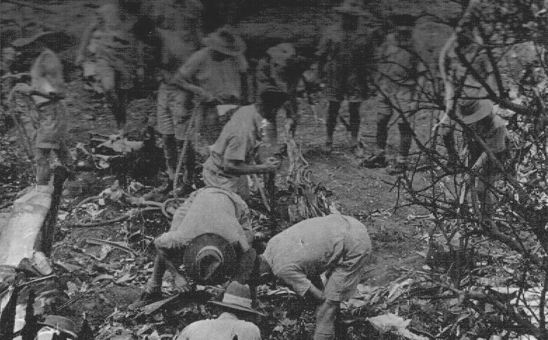 the disconsolate men in this photo are Harry Clare's mates, viewing the ashes of their formerly-comfortable tent