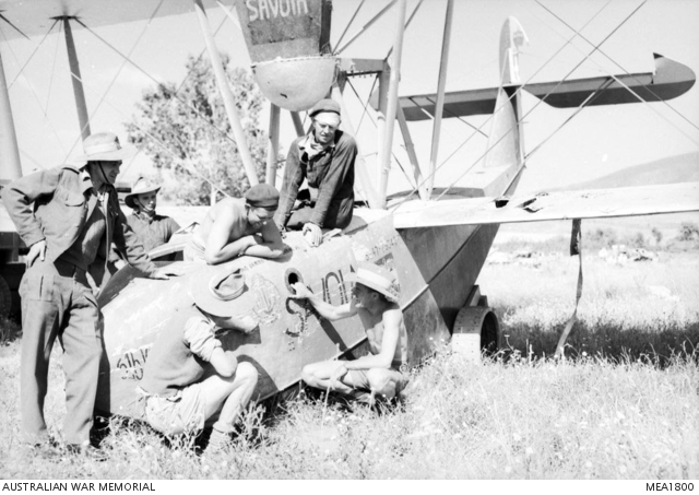 Guidonia, Italy. c. June 1944. Ground crew members of No. 3 (Kittyhawk) Squadron RAAF, inspect a Savoia amphibian aircraft abandoned by the enemy on an Italian airfield some miles from Rome. On its fuselage is emblazoned an RAAF badge with the words "Pt. Cook" [the name of the famous RAAF flying school, located near Melbourne] beneath it. The discovery excited much speculation until an Italian explained that the Savoia had been flown out to Australian in 1926 by the Italian aviator Di Pinedo. [AWM MEA1800]
