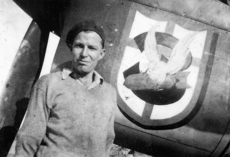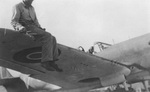 Photos show L-R: An overall shot of CV-V with the artwork applied. At this stage it also has the replacement wingtip (Neutral Gray below & probably Olive Drab above). The next two are close-ups of the artwork applied to the nose. Notice there are differences to the version on the flag shown above. The crest is basically a bird with bomb (a Kittyhawk maybe) and the number '3' superimposed on the standard Desert Air Force badge. Finally a photo of Brian Eaton himself. Photos - Arthur Dawkins & Ken Richards
