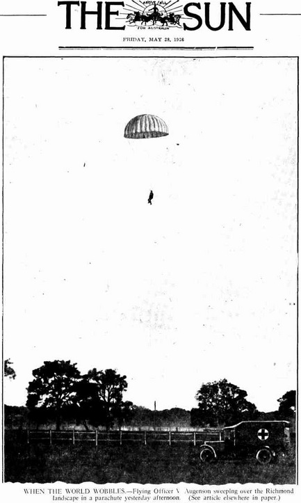 Augenson was the hero of the hour at the flying school. Everyone at the Flying School was agreed that the first [“free fall”] parachute descents in Australia from a speeding 'plane had been eminently successful. Lieut. Lukis, who is in charge of the Richmond aerodrome, was highly pleased.