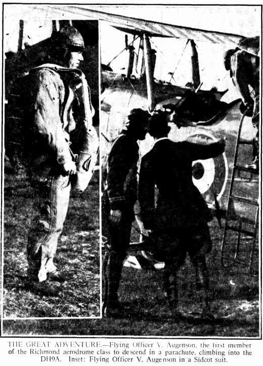 Richmond, Friday. - The first parachute descents to be carried out in Australia by the Royal Australian Air Force were conducted at the Richmond aerodrome this week, by members of No.3 Squadron, under the supervision of Flight-Lieutenant [Ellis] Wackett, who was sent up specially to instruct the unit in this form of aeronautics. The first actual descent was made by Flight-Lieutenant WACKETT [Thursday 27 May], who was followed by Flight Officer V. H. AUGERSON. He was taken up in a DH9 and climbed to a ladder on the side of the 'plane, preparatory to leaping off at 3000 feet.