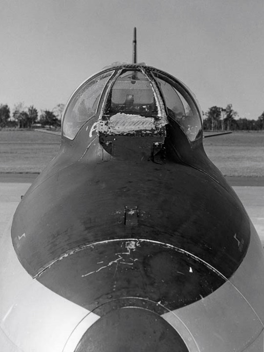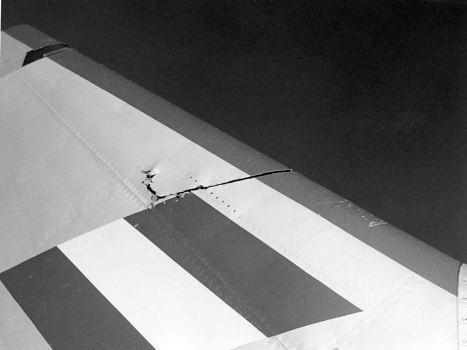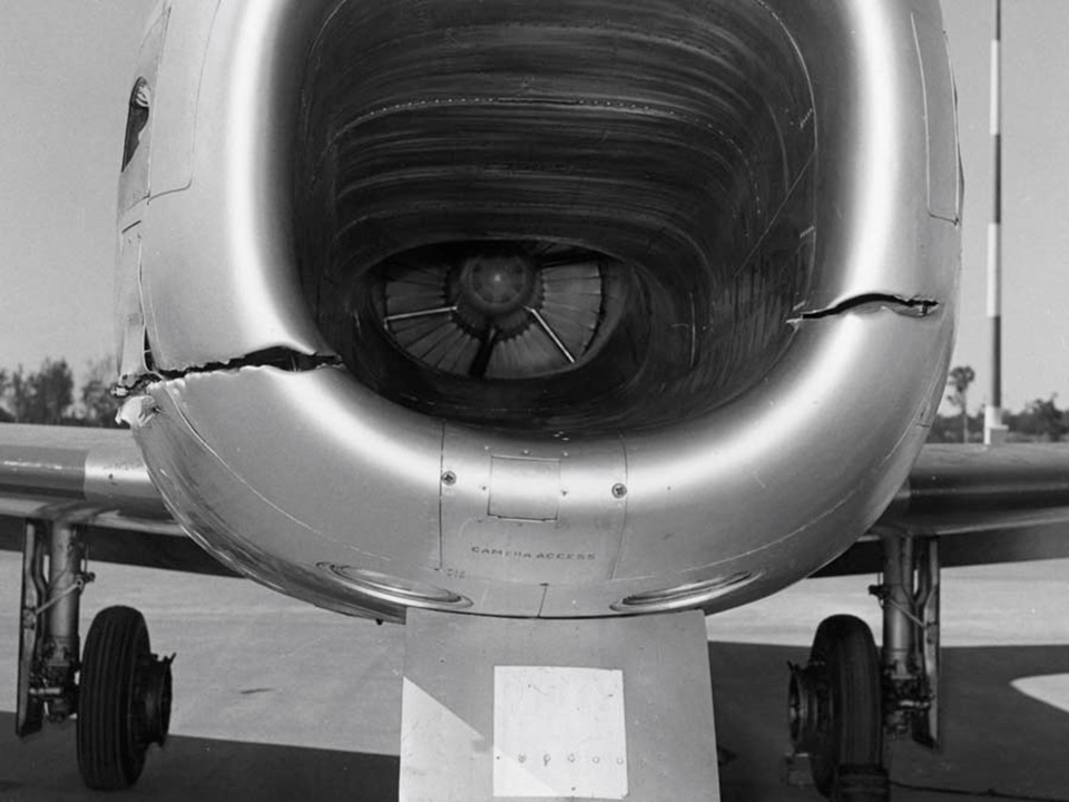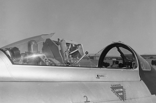 Initially, David didn’t comprehend what had happened. Suddenly finding himself in an open cockpit, he reduced his airspeed. A visual inspection by his wingman revealed the damage to air-intake and tail.