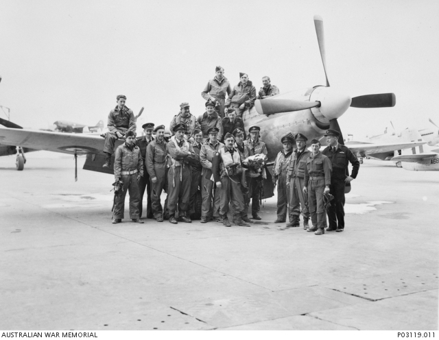 Time was spent training on the new aircraft, and becoming proficient on ground attack duties both with guns and rockets. The technique of rocket delivery was taught by a couple of Kiwi pilots from 14 Squadron RNZAF, who had experience in firing rockets from their Corsair aircraft. Off duty, Fred toured the countryside and found the locals friendly and polite, much to his surprise. Training and massed fly-overs with the Allied Forces were the daily duties during this period.