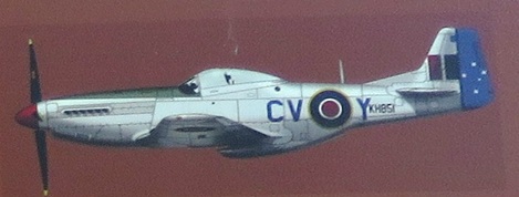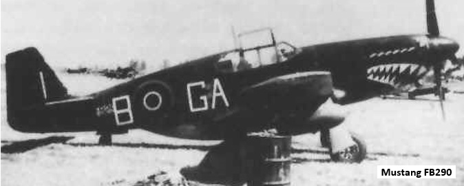 McInerheney’s Mustang (a Mark III, coded “CV-J”, serial FB290) was camouflaged dark green/grey and had an old-fashioned “hinged” style of cockpit frame. (Which failed to jettison at John’s critical moment!) This aircraft had seen previous service with 112 Squadron RAF (“Shark Mouth”) and 260 Squadron RAF, both of which operated alongside 3SQN as part of 239 Wing in Northern Italy.