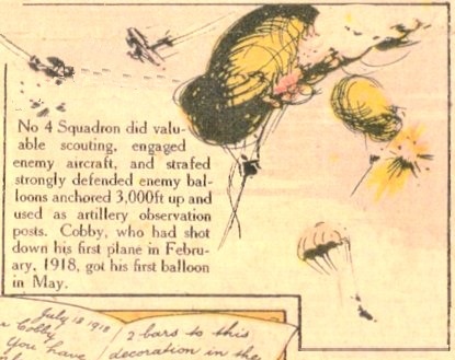 Arriving at Plymouth on 27 March, Cobby was sent to Castle Bromwich for training. After learning to fly Sopwith Camels he arrived in France with 4AFC on 18 December. He shot down his first enemy aircraft on 3 February and by September had shot down 29 aircraft and 13 balloons, becoming the highest scoring ace in the Australian Flying Corps. By the end of the war, Cobby had been awarded the Distinguished Service Order and DFC with two bars, and was Mentioned in Despatches.