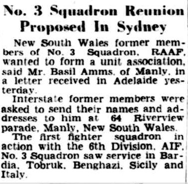 The suggestion was then made that a re-union of ex-3 Squadron members should be held on 15 July, the date on which the Squadron embarked for the Middle East and forthwith a committee was elected: Bas Amm, Bill Maloney and Bill Madigan. It was anticipated from the addresses available (all belonging to the early period of the Squadron's history) that only 30 would attend.