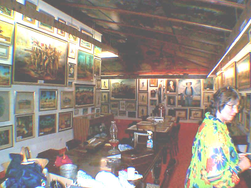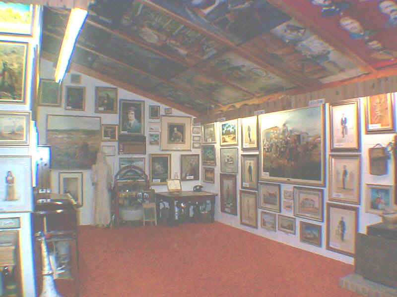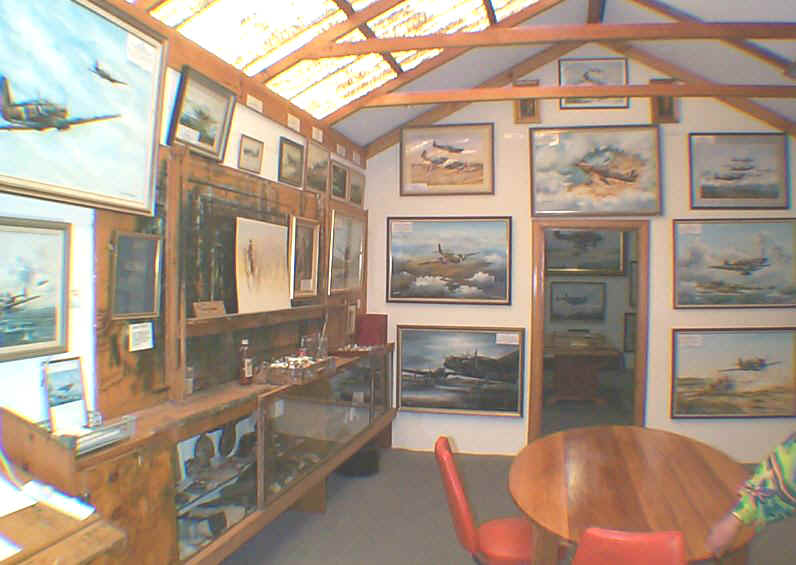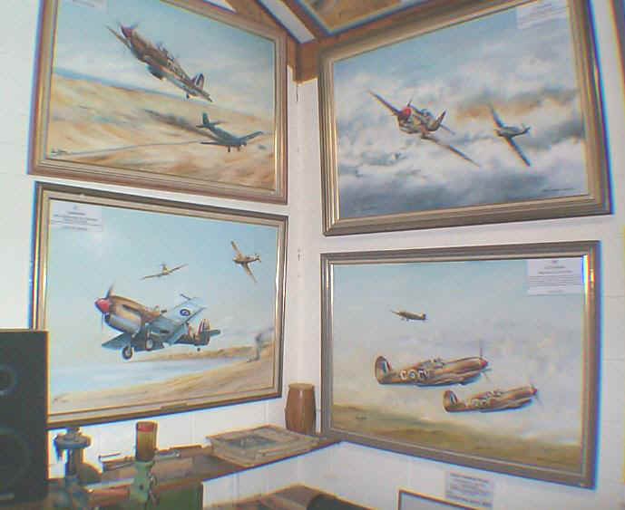 (Ph: (08) 8586 6972.)You will see the many glorious paintings including those shown above, illustrating some of the more unusual events and accomplishments achieved by 3 Squadron's pilots, and Australians from other Squadrons, flying their aircraft during WW2. Many of these paintings have been reproduced in the collector's edition of "They Flew For The King" (a few copies of which are still available from Nan at Aust $125 each - write to Box 16, Renmark, S.A., 5341). As well the Gallery houses hundreds of Frank's distinctive and talented paintings and illustrations which artistically describe life in early Australia with many artifacts and mementos collected by the Hardings also on display. Here are a few photos of this unique Gallery:
